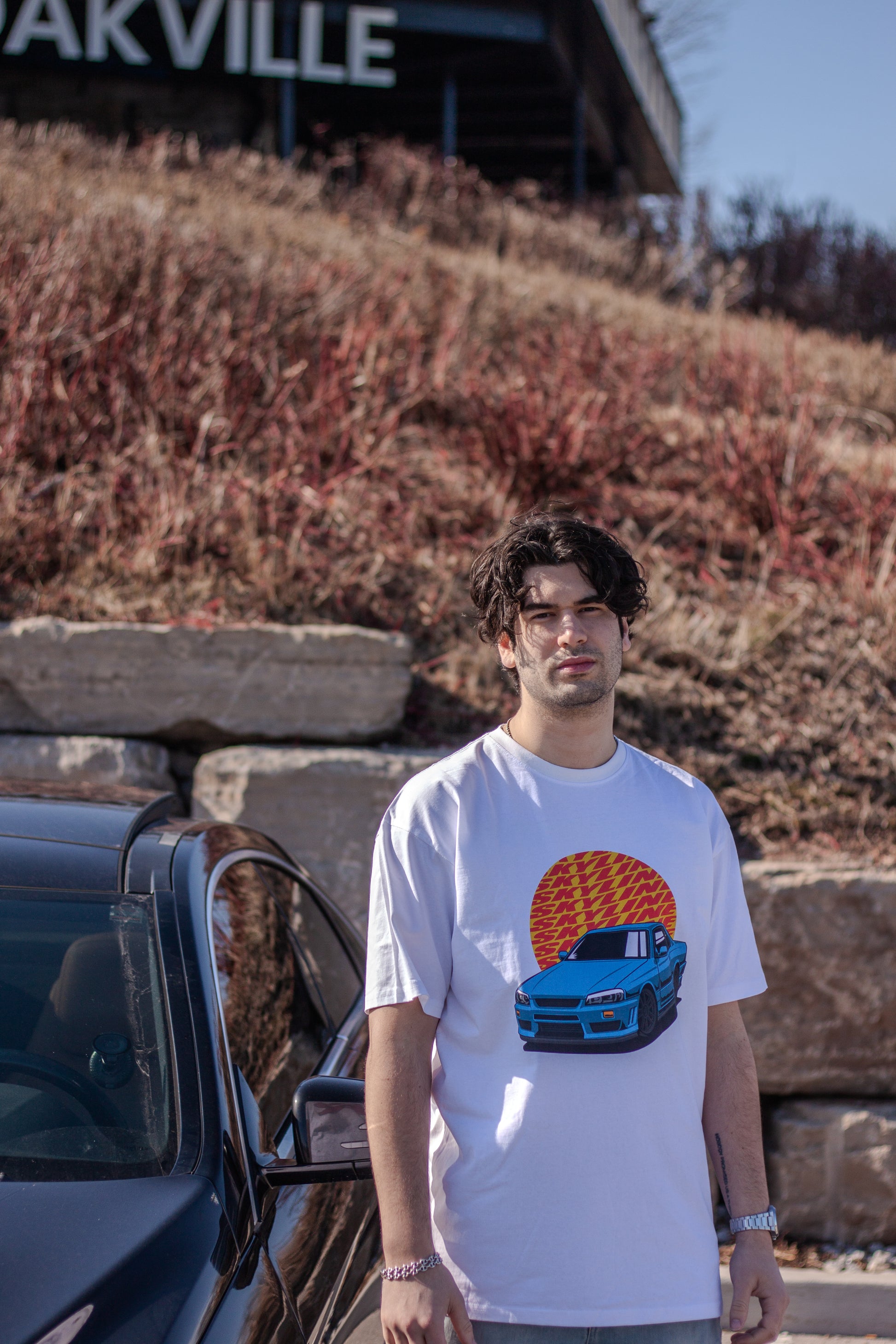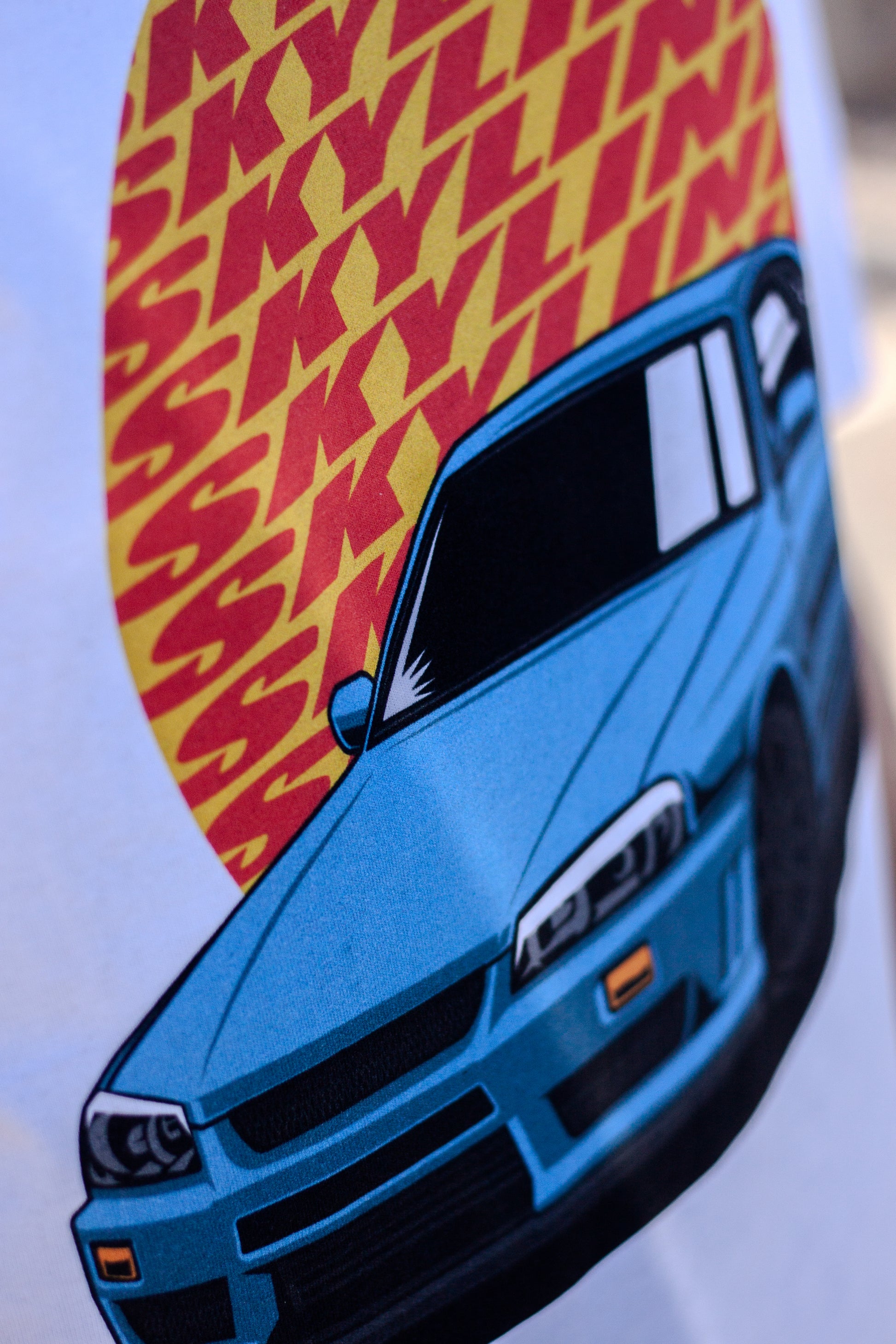 Retro design for a retro car. One of the JDM classics, the R-34 generation of the Skyline. Cemented in history as an all-time great. Oh right, the t-shirt is pretty sick too.